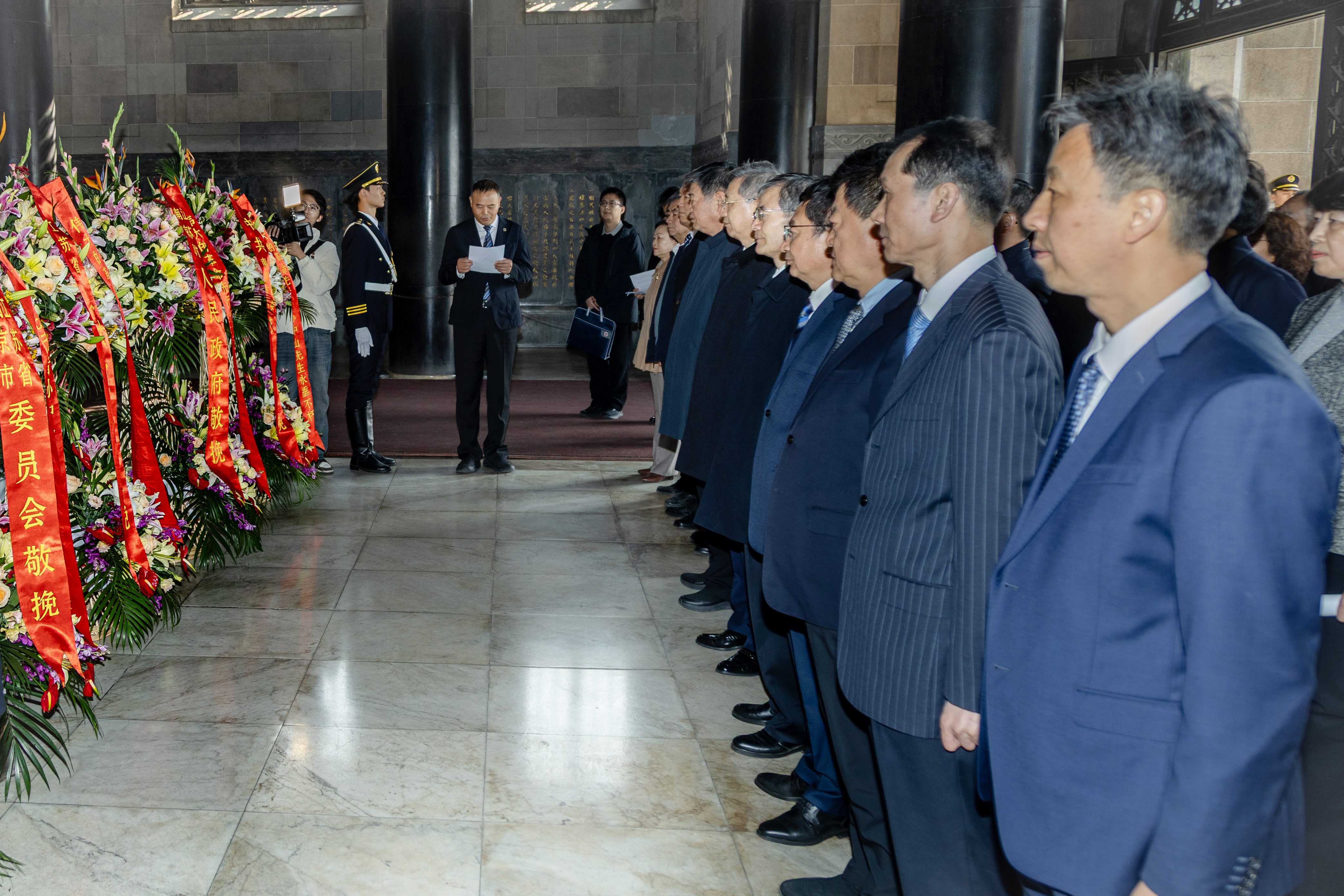 9时,参加拜谒的各界人士在博爱坊前合影留念,随后拾级登上肃穆庄严的陵顶祭堂,在中山先生坐像前肃立静默。在民革江苏省委会负责同志主持下,省、市人大常委会,省、市政府,省、市政协,中共江苏省委统战部、南京市委统战部,民革江苏省委会、民革南京市委会有关领导,分别向中山先生坐像敬献花篮。接着,各界人士行三鞠躬礼表达崇高敬意和怀念之情,并缓步绕灵寝一周,深切缅怀孙中山先生毕生致力国家统一、民族团结、中华振兴的不朽业绩,期盼祖国完全统一和中华民族伟大复兴。