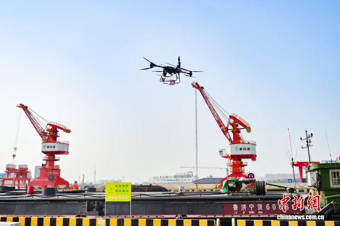 江苏淮安黄码港产业园中,一架无人机从智慧物流港保供商品储备库飞向停泊在港口的货船。受访者供图