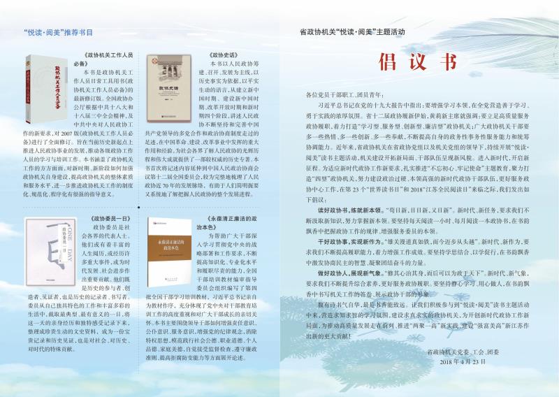 为适应新时代政协工作新要求,扎实推进“不忘初心、牢记使命”主题教育,聚力打造“学习型、服务型、创新型、廉洁型”政协机关,努力打造一支对党忠诚、爱岗敬业、能力过硬、清正廉洁的机关干部队伍,更好服务政协中心工作,在第23个“世界读书日”和2018“江苏全民阅读日”来临之际,4月23日省政协机关举办了“悦读·阅美”主题活动书展。