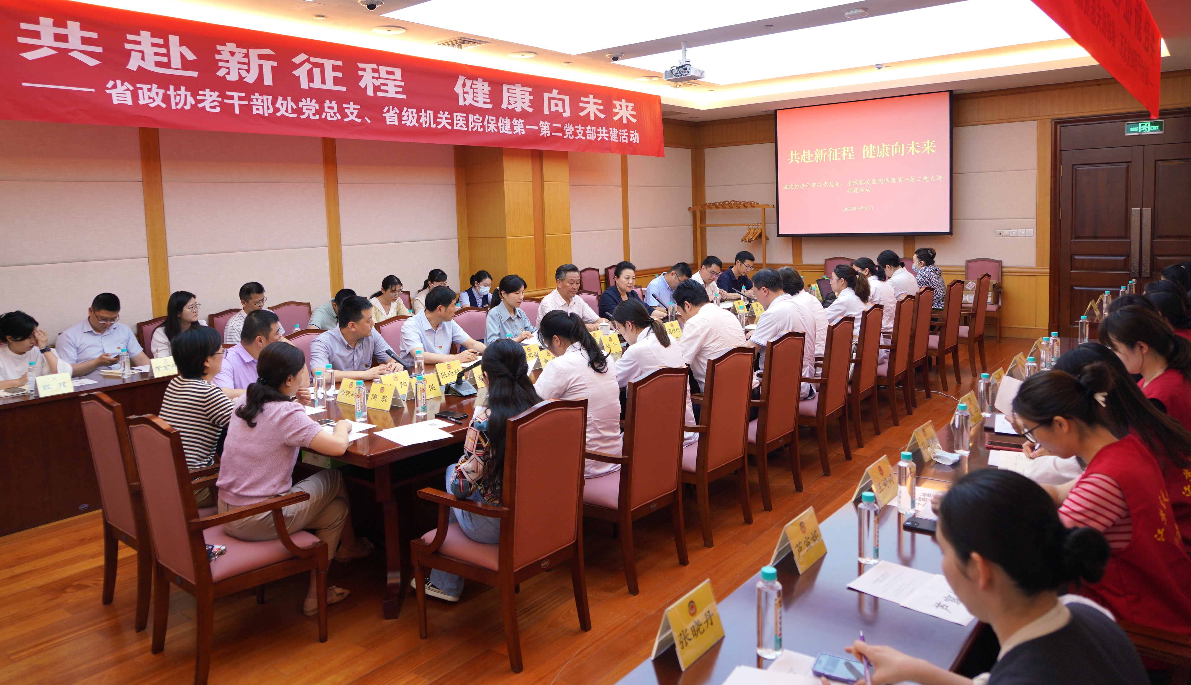 在迎接中国共产党成立102周年之际,为深入开展主题教育,6月27日,省政协办公厅老干部处党总支与省级机关医院保健第一、第二党支部开展“共赴新征程、健康向未来”共建活动,充分发挥省政协机关老干部党性强、作风好、经验丰富的政治优势和省级机关医院健康保健的独特优势,构建“资源共享、优势互补、互相促进、共同提高”党建工作新格局。省政协副秘书长、办公厅主任朱从明参加有关活动。