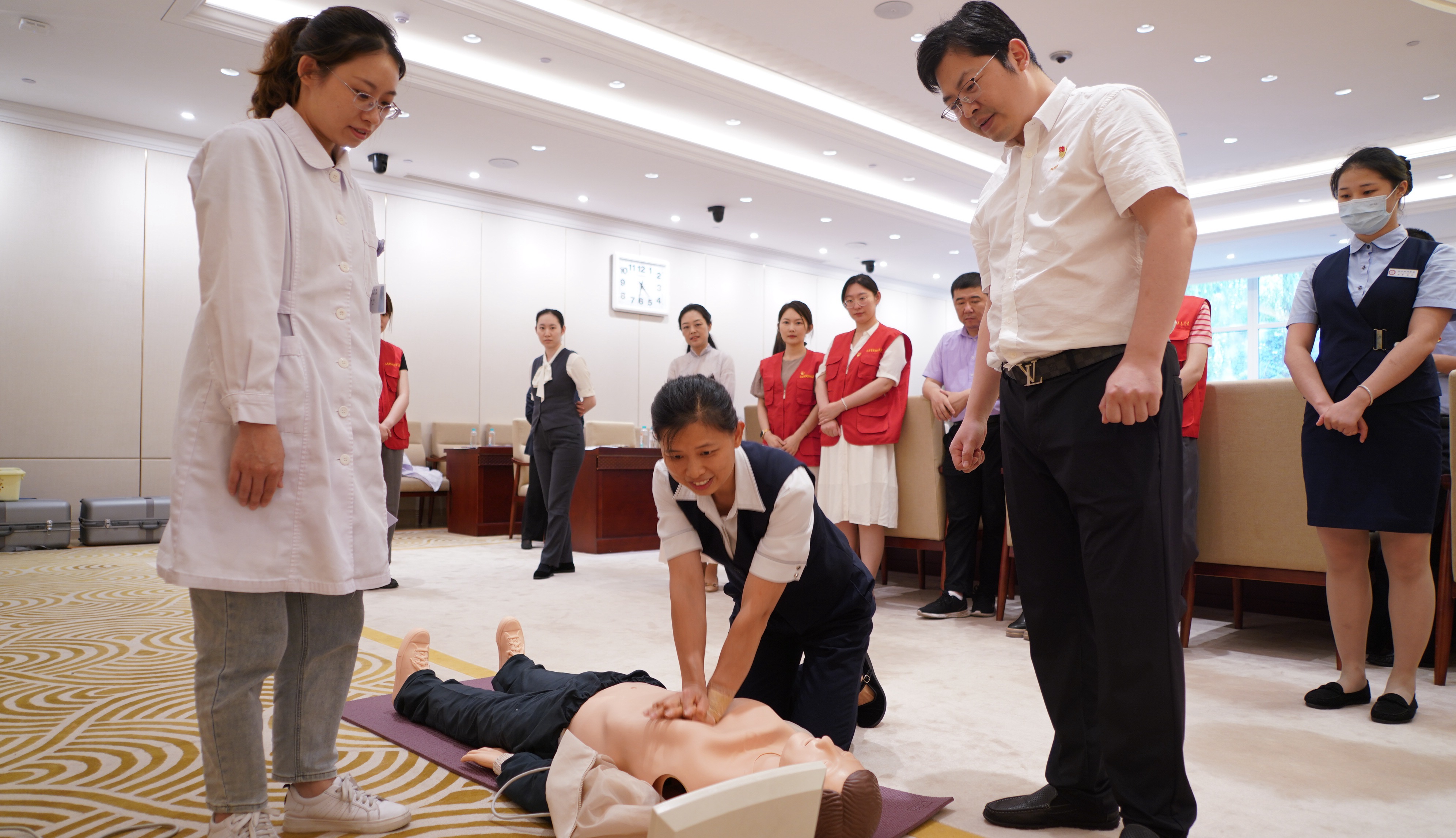一次培训提升技能。省级机关医院保健第一、第二党支部医护人员为大家讲解心肺复苏理论知识、AED使用技能,进行心肺复苏现场培训、练习及操作考核。拍打、呼叫、按压、吹气……在专业医护人员的指导下,大家逐渐熟悉了心肺复苏的操作流程,学会了AED使用方法,一致表示,急救培训专业性、实用性强,不仅让大家掌握了急救知识技能,还能在真正遇到危险的时候做到心中有数、临危不乱。